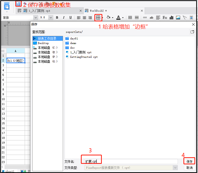 ② 给该单元格增加“边框后”,保存这个新建的模板数据集,并命名为“扩展”。