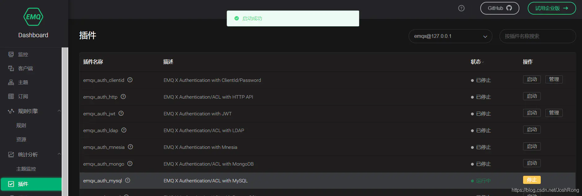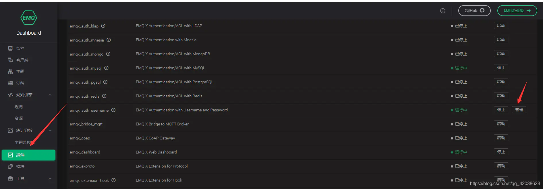在DashBoard的左侧点击“插件”一栏,找到 emqx_auth_username 插件,点击开启(这里我已经命令行开启,所以显示停止):