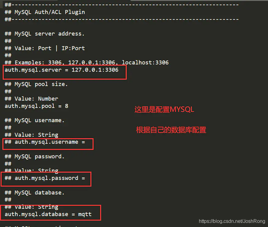 首先我们要配置emq里的mysql.conf才可以使用MYSQL认证插件