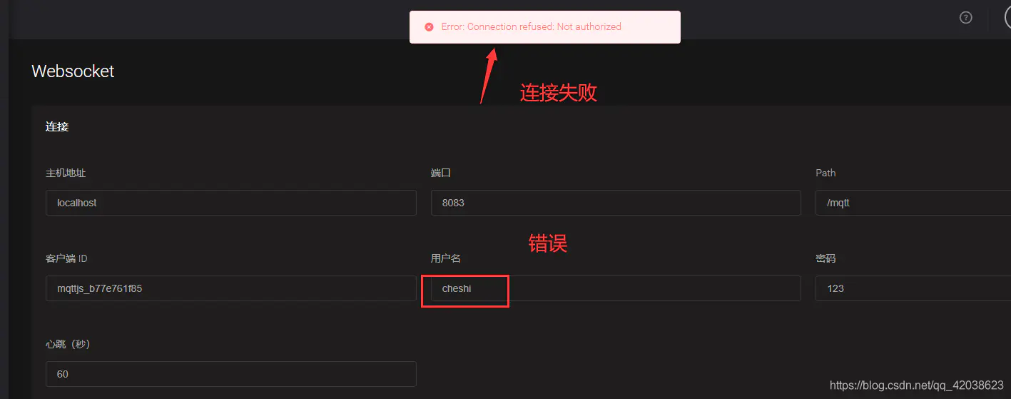注意:如果账号密码都正确,还是连接失败,则可能是配置问题,查看emqx_auth_mysql.conf