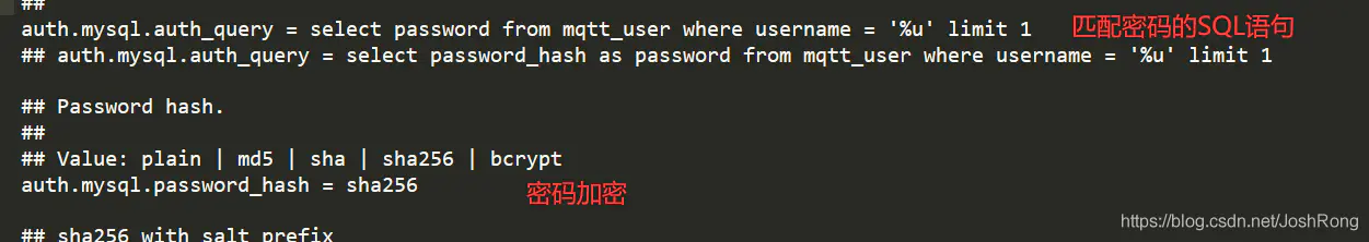 1.auth.mysql.username和auth.mysql.password 这两个配置字段前面的#号没去掉。