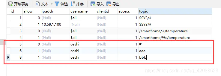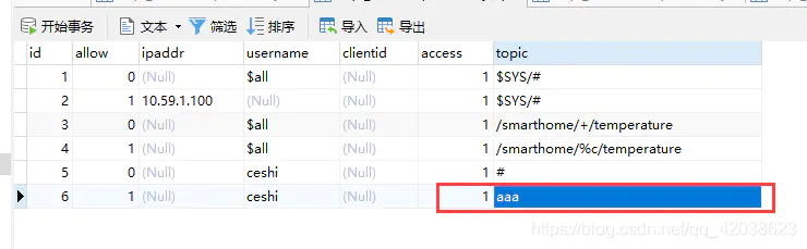 如果需要允许订阅两个topic,只需要新添加一条数据topic即可这样就可以允许该客户端同时订阅两个topic。