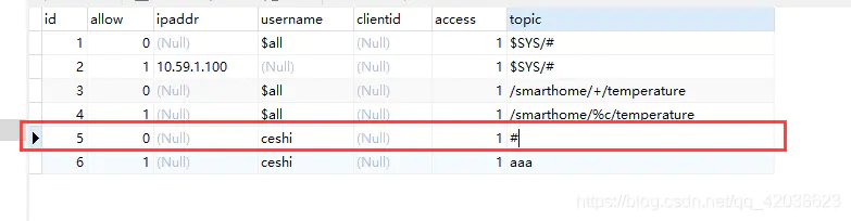 来到ACL权限控制,使用到数据库mqtt_acl数据表。这里引用官方文档关于表内字段的说明