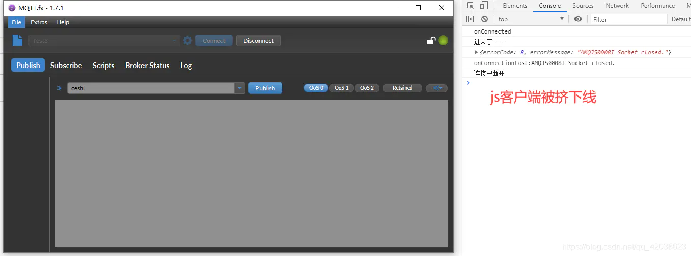 在连接EMQX客户端时,连接属性中clientId是唯一的,如果使用同一个clientId登录客户端两次,后面登录的客户端会将前一个挤下线,前一个客户端将会断开连接。
